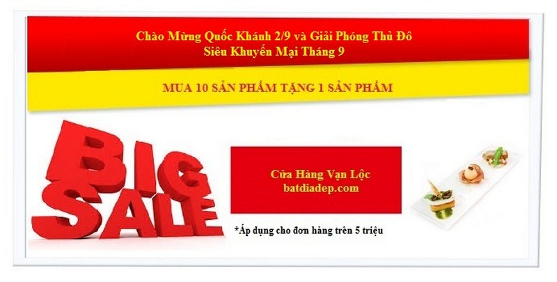 Chào mừng Quốc Khánh 2/9 và Giải phóng Thủ Đô cũng như để tỏ lòng tri ân tới Quý Khách Hàng, Cửa hàng Vạn Lộc chuyên kinh doanh Bát Đĩa Tô Chén Ly Cốc Đũa Thìa Muông Melamine Sứ Ngọc Nhật Bản Hàn Quốc cho Nhà Hàng Khách Sạn Mua 10sp Tặng 1sp tại Shop. Xin trân trọng cám ơn sâu sắc tới Quý Khách Hàng đã yêu quý và ủng hộ Shop.